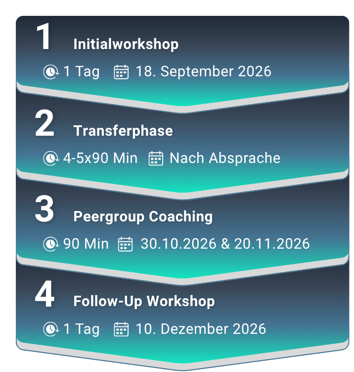 Transferphase: Individuelle Themenbearbeitung mit Coaching, Modellen und Werkzeugen – konkret angewendet im Führungsalltag. Ergebnis: persönliches Wachstum und klare Verhaltensveränderungen.
